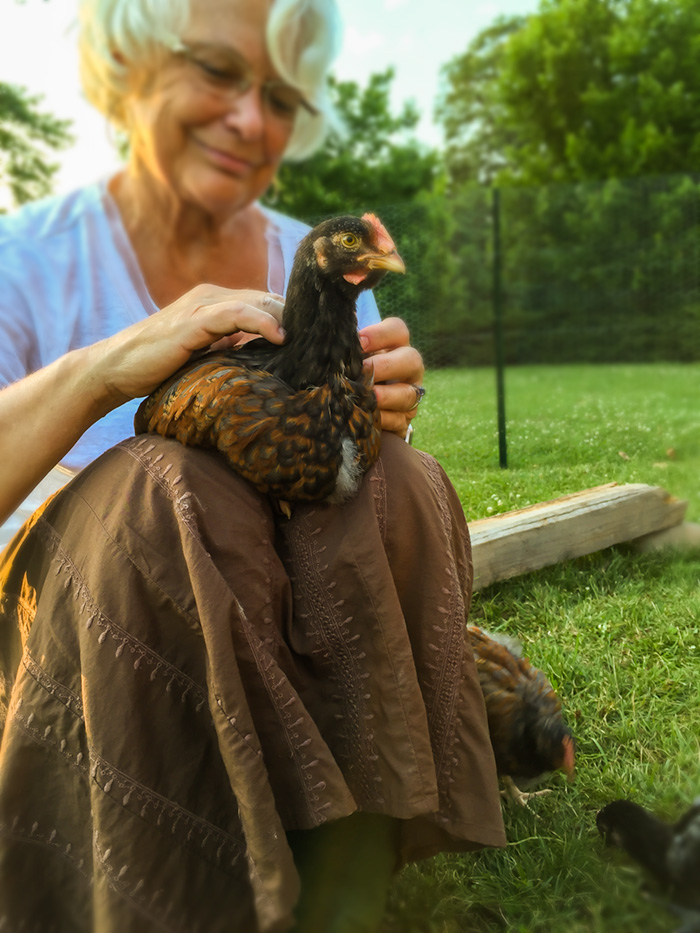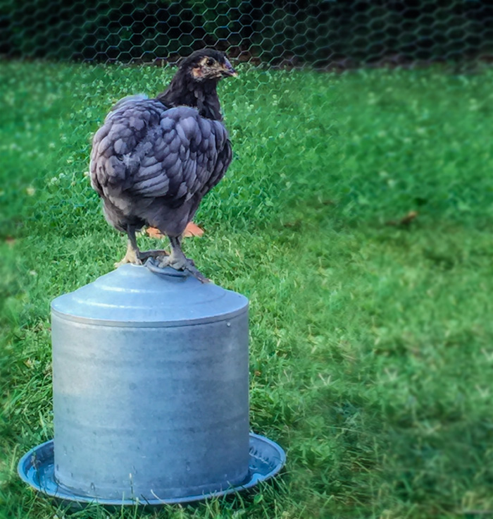 So. We switched horses midstream. Literally. As a result… I had to go out in the pouring down rain… and catch four little chickens, while the Orpingtons watched from the safety and shelter of their coop. I moved the New Hampshires back to the garage, where Mike had quickly set up their old pen. Soggy chickens… no more. In fact… dry… Happy Chickens.