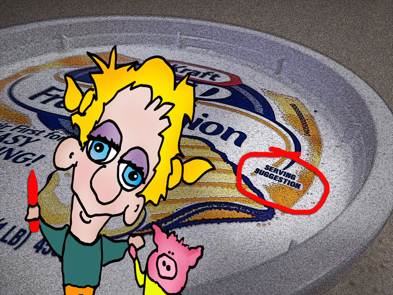 Yep. Old Floyd Clemmens… he’s been with Kraft for nearly 3 decades… leapt from his desk one day… ran into Mr. Jenkin’s corner office, and announced … “I’ve GOT IT! Let’s put the words Serving Suggestion right next to the picture of the chip with the dip on it. Just in case someone doesn’t understand.”